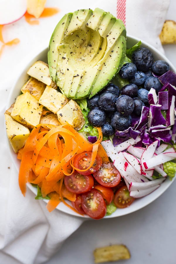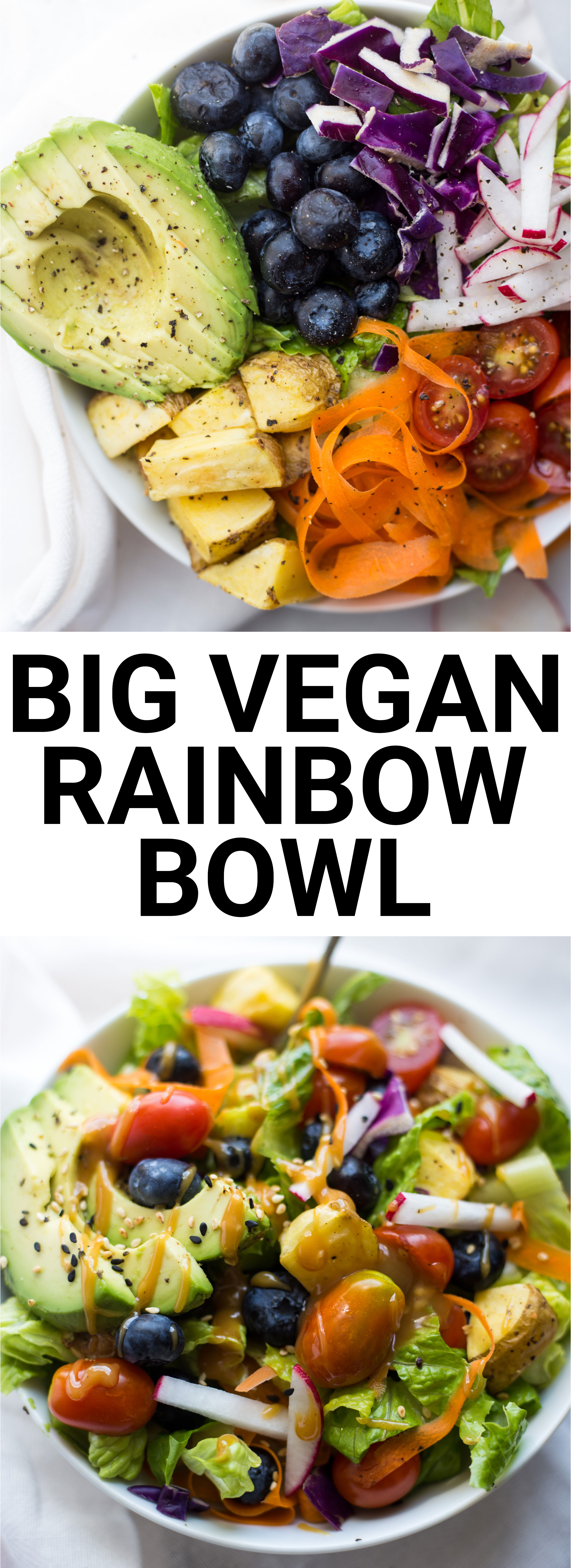 Enter: The Big Vegan Rainbow Bowl. These colors make me so so happy. Pretty, colorful food always always always tastes better. And friends, we really do have all of the colors of the rainbow representin’ in this giant salad bowl: