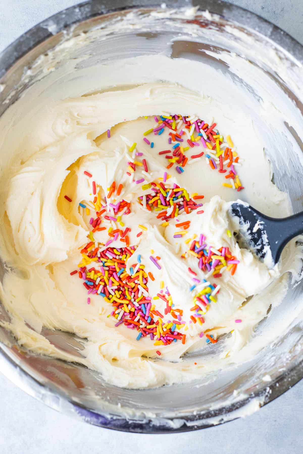 The frosting required me to mix the packet ingredients (the sugar mixture and the sprinkles) with butter as well, and I used vegan butter instead (the Trader Joe’s stick version). I also needed a tablespoon or two of milk to get the frosting to the spreadable consistency I was looking for, as it was pretty stiff without.
