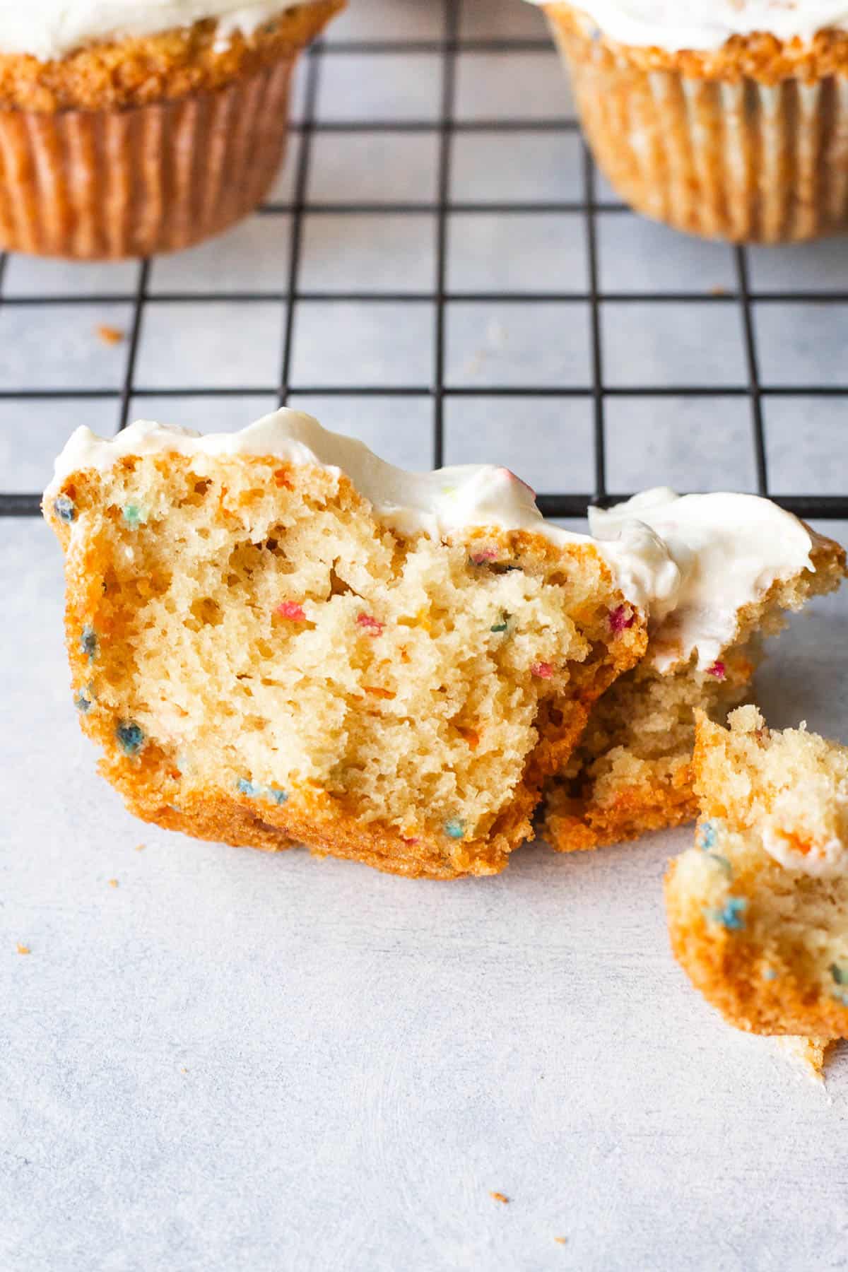 Even though I definitely overfilled my cupcake tin (and overbaked everything slightly because of that lol), the crumb was super tender, light, and delicate and the flavor was incredibly nostalgic and fun. Just very vanilla-forward, and that’s about it. But I wasn’t mad at it because it tasted so much like the yellow birthday cakes I used to have at parties as a kid.