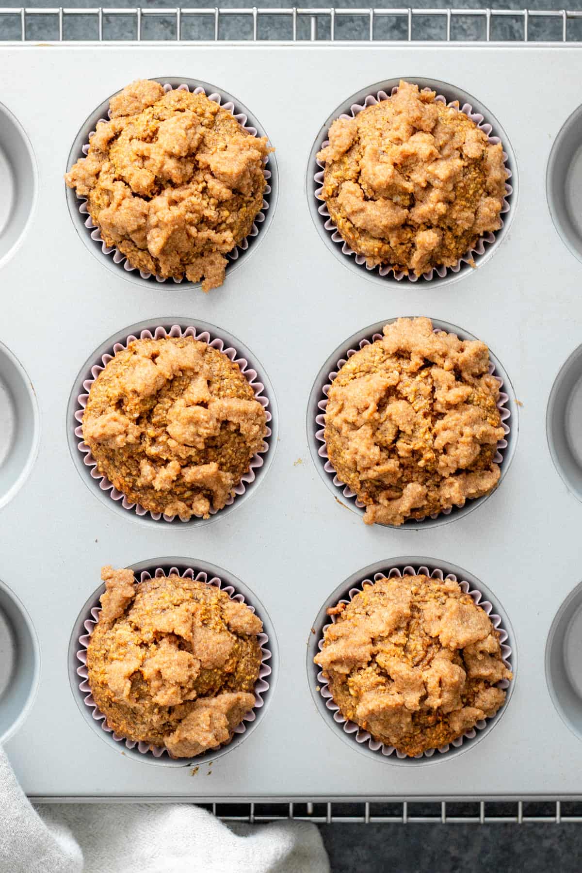 - Line a muffin tin with six muffin liners. Add a heaping tablespoon of batter into each liner. Sprinkle a bit of crumble on top of the batter, breaking up big chunks with your fingers. Top with the rest of your batter, filling to just about the top of each muffin liner. Add some crumble on top, again breaking up any big chunks with your fingers.