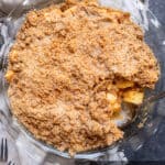 - Add your apple mixture and all of the juices to a 9-inch pie plate. Crumble the topping over the top and bake for 30-35 minutes, or until the topping is golden. When it comes out of the oven, sprinkle over your remaining cinnamon-sugar mixture. Serve warm or at room temp!