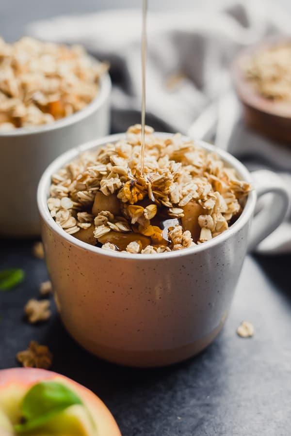 - Scoop your apple mixture into serving bowls of your choosing and top with a mound of your granola. Top with a drizzle of maple syrup (if desired) and dive in!