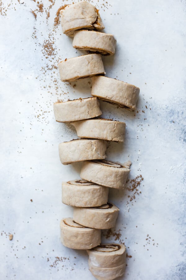 - Tightly roll the dough from the long side. If it’s particularly warm and the dough is getting too warm, take the entire log on the baking pan or cutting board and place in the fridge to chill for 10 minutes. Cut into 12 equal pieces.