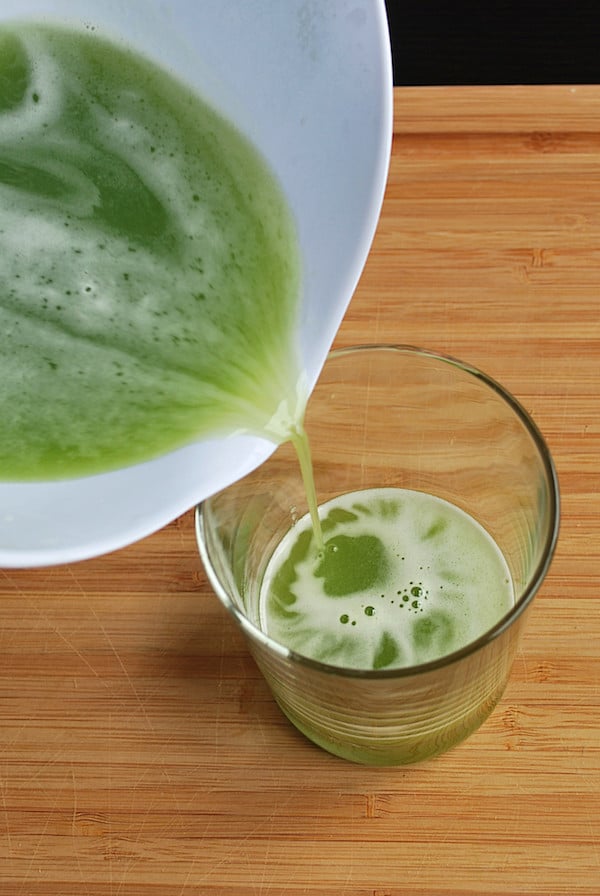 Step 4: Slowly empty your juice’s contents into the fine mesh strainer. The fibrous pulp will stay in the sieve, while the super duper smooth juice will drain into the bowl.