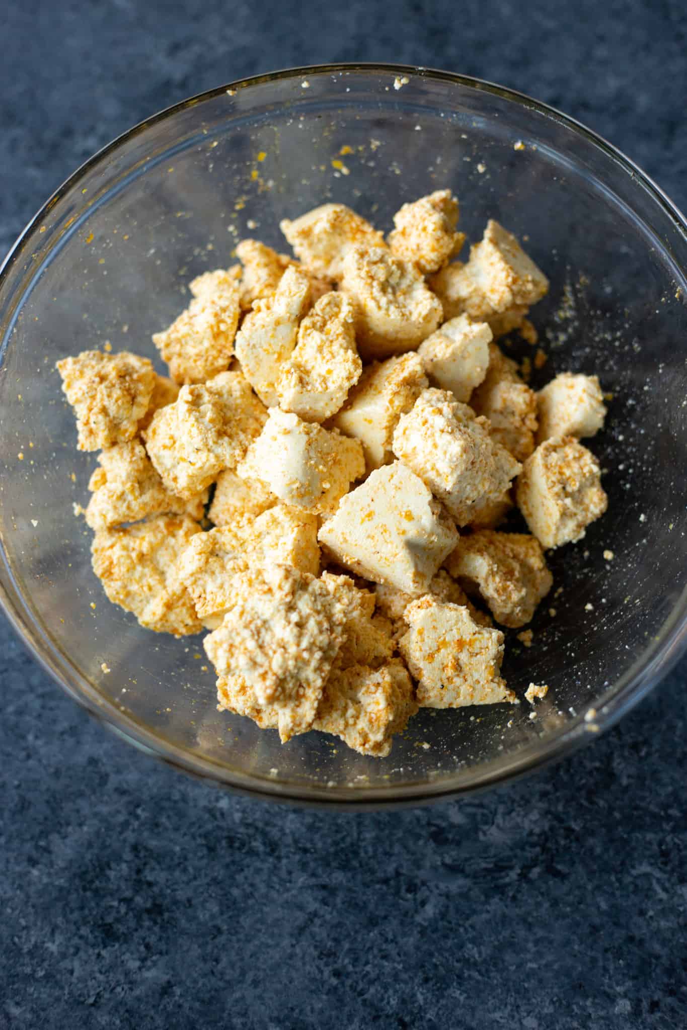 - Place each nugget on your prepared baking sheet so that it’s not touching the other tofu pieces. If you have a few small bits of broken tofu at the bottom of your bowl, add a bit more cornstarch and squeeze the bits together to form nugget-sized pieces. These guys get EXTRA crispy when baked!