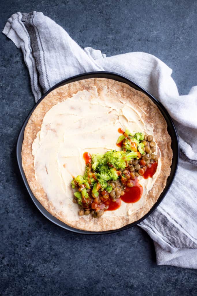 - Add a small dollop of hummus onto your wrap and spread it thin to coat one side. Add lentils, broccoli, and hot sauce to once side of your wrap (like you’re making a burrito), and wrap tightly into a taquito-like shape. Continue with the rest of your roll-ups.
