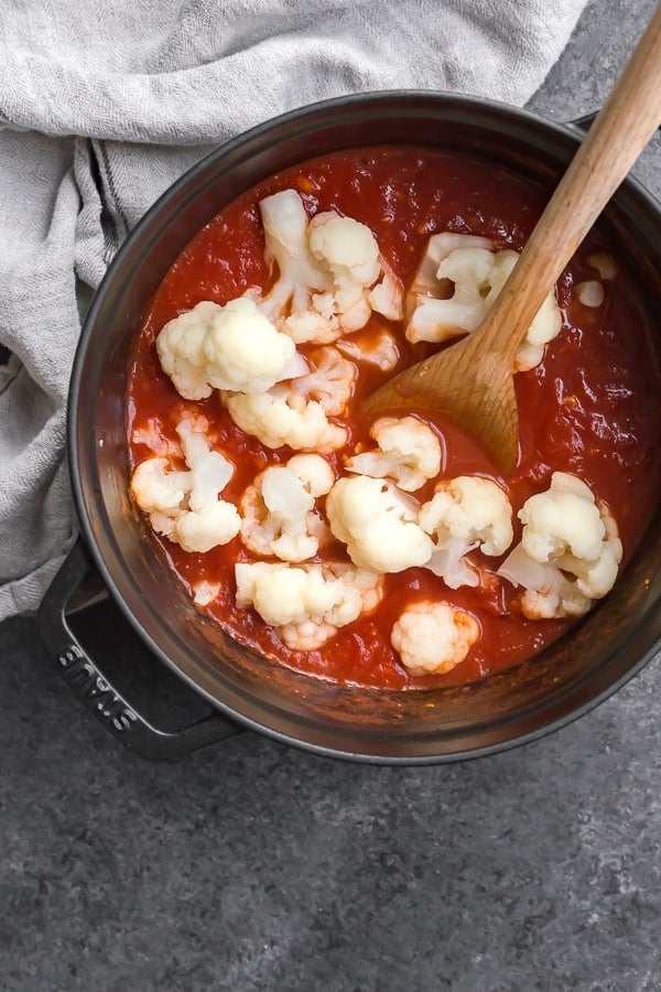 - Add your tomato mixture and your cauliflower to a blender and (carefully! it’s hot) blend until smooth. Season with salt and pepper and serve hot with croutons, fresh basil, and / or fresh cracked pepper.