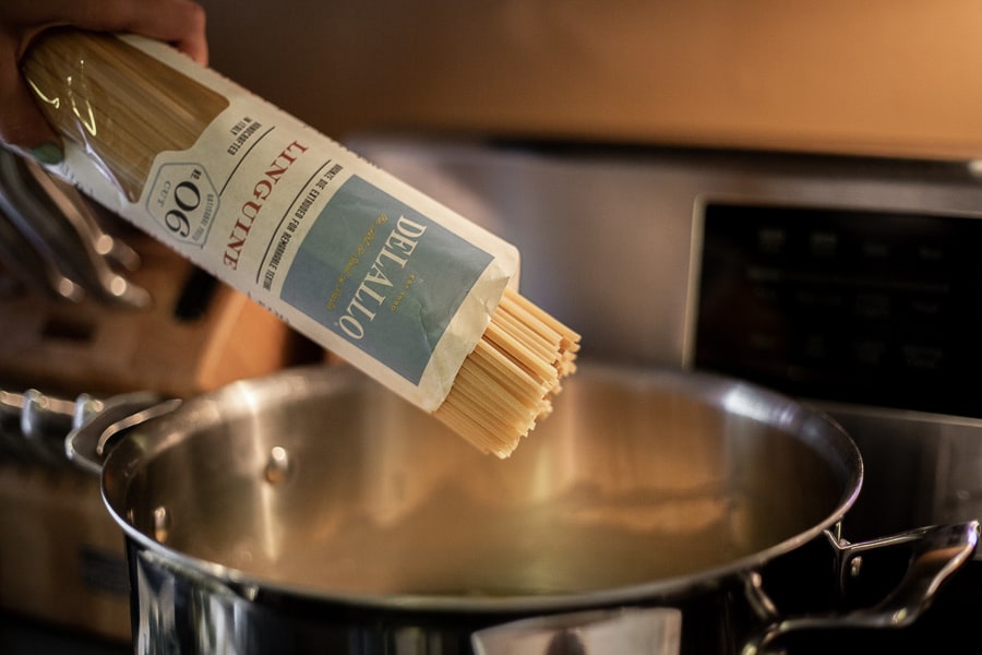 - Bring a medium pot of salted water to a boil. Add your pasta and boil until al dente, about 10 minutes. Stir often to avoid sticking. When the pasta is almost done cooking, carefully scoop out 1 and 1/2 cups of pasta water and set it aside. You’ll need it for the sauce.