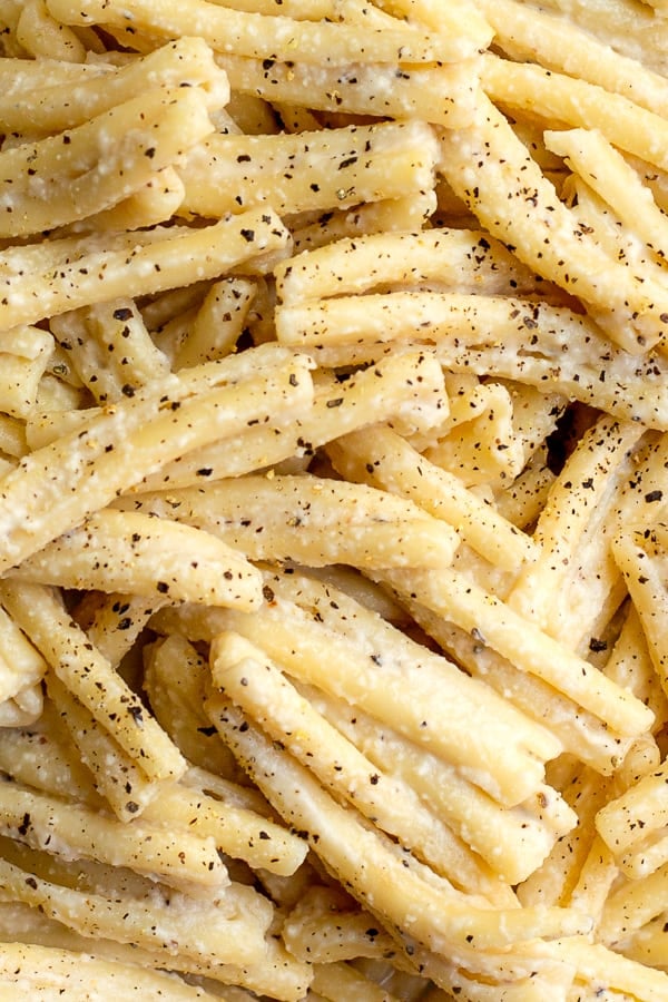 This post is sponsored by my Pittsburgh-based friends, DeLallo! We’re using their beautiful new Casarecce Pasta in this Vegan Cacio e Pepe recipe.
