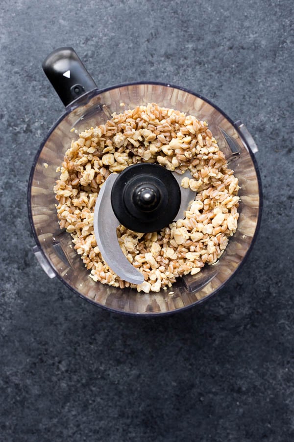 - Add tempeh and farro to your food processor and process until broken down and crumbly. You want it to look like beef crumbles!
