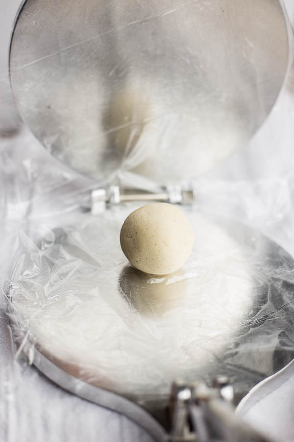 Step 4: Prepare your handy dandy tortilla press. You’ll want to place a piece of saran wrap between the two flat parts. The tortillas will stick to your press if you skip this step. And that would make for a very sad taco.