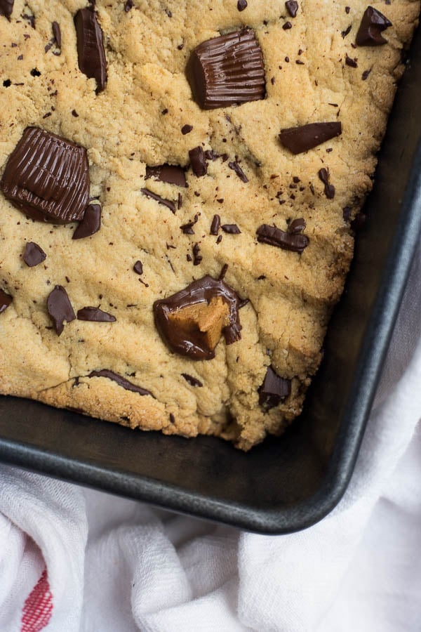 Dense and chewy blondies are filled with peanut butter cups and dark chocolate! Naturally gluten free, vegan, and refined sugar free and ready in 30 minutes!