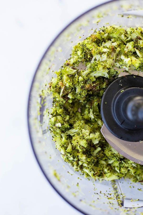 - When the broccoli is roasted, carefully pour it into a food processor. Pulse until small pieces of broccoli remain (see photos).